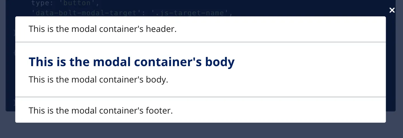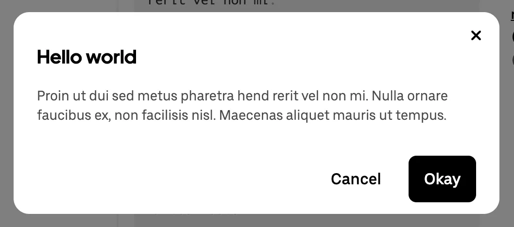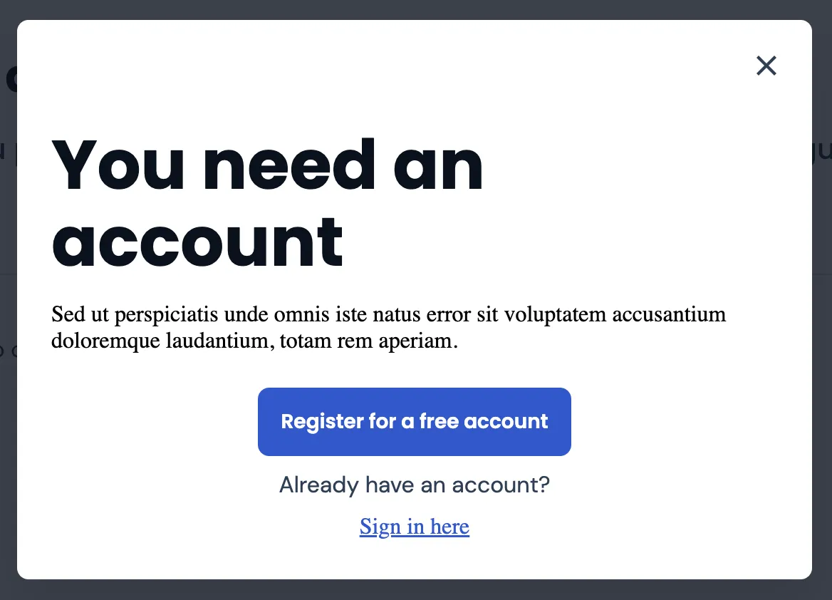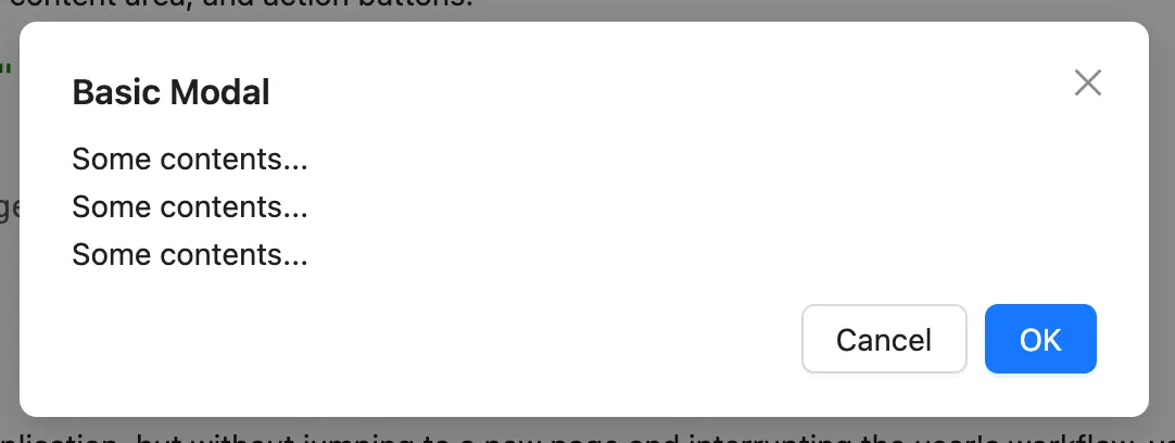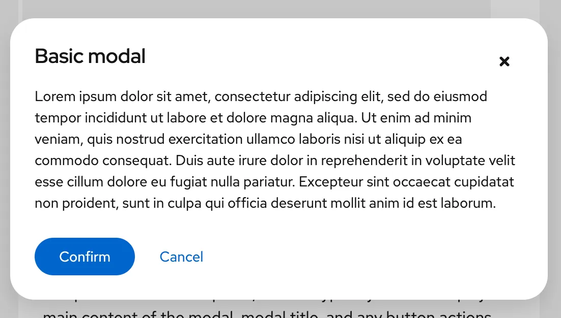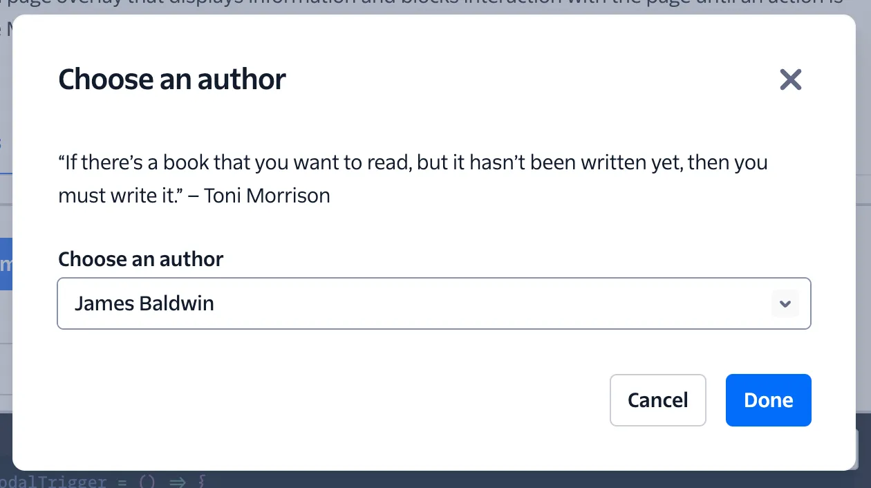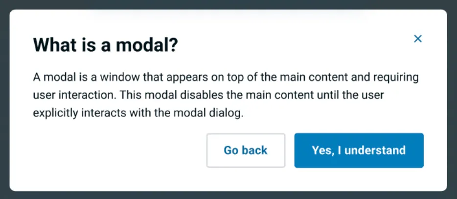 A modal is an interface element that appears over other content. It requires an interaction from the user before they can return to whatever is underneath.